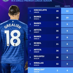 埃弗顿单赛季助攻王榜:塔帅占两席;格拉利什有望冲击纪录