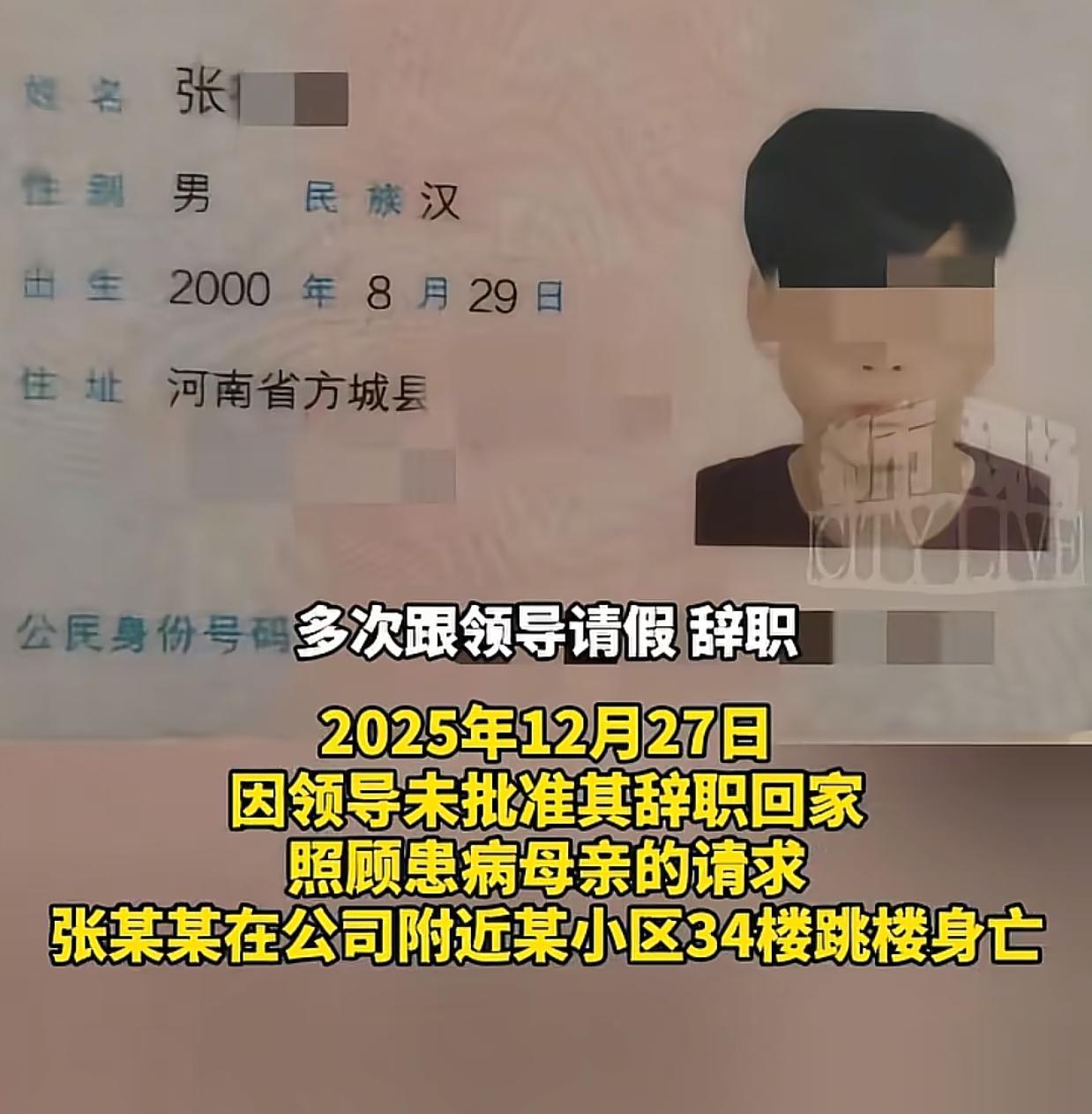 据小张的姐夫透露,小张之所以会选择用跳楼这么决绝又惨烈的方式自杀,是因为他的母亲生病了,且病的有些严重,小张向公司请假,想要回河南老家照顾母亲。